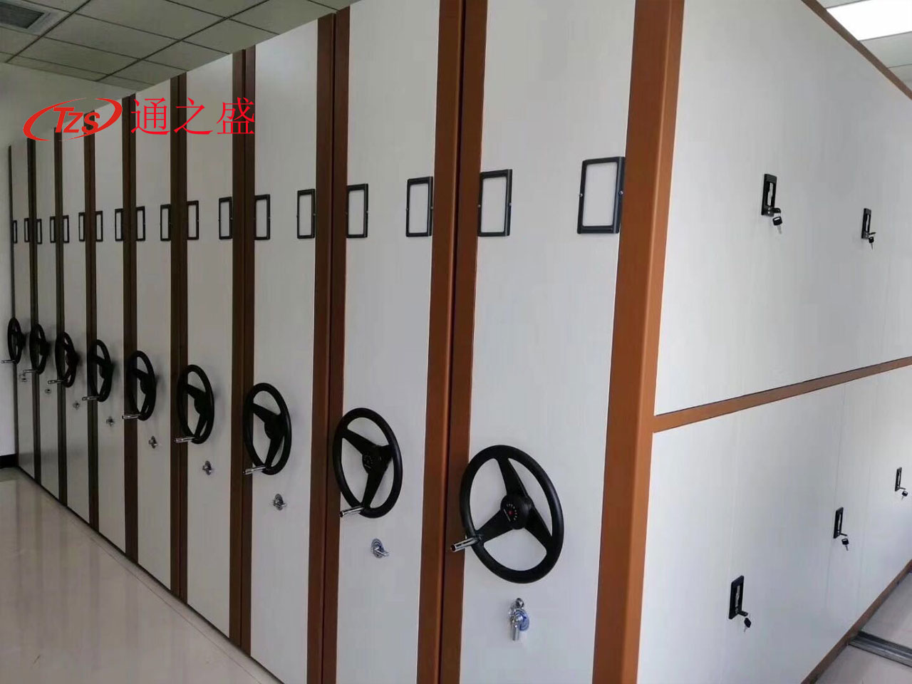密集柜是根据库房特征进行合理布局的,高度利用空间,采用多节多联安放在固定的轨道上形成一整体,用手摇或电动方式移动各列存取。